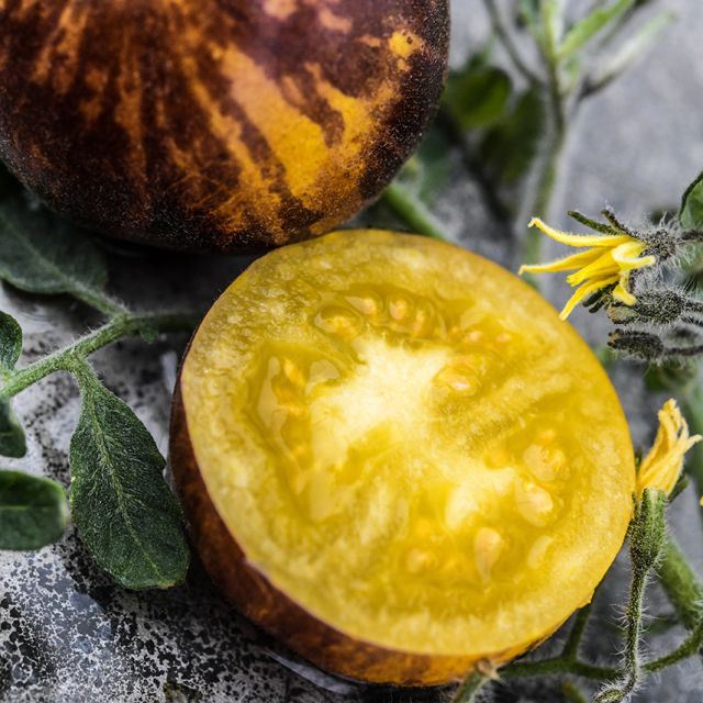 Wooly Kate Tomato – A rare breed of tomato, this sunny yellow fruit with blue shoulders is covered in a light peach fuzz! These cocktail-type tomatoes reach 2-3 inches in diameter, making them an excellent snack tomato. It is also wonderful in salads and cooked dishes. From the legendary tomato breeder Tom Wagner.