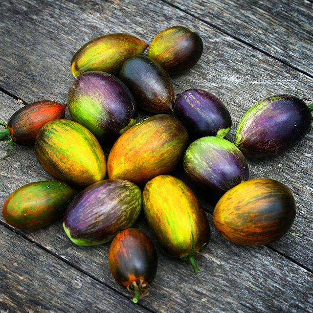 Brad’s Atomic Grape Tomato – Large, elongated cherries in clusters. The color (and flavor!) is intense—lavender and purple stripes that turn to Technicolor olive-green, red, and brown/blue stripes when fully ripe. Crack-resistant fruit is extraordinarily sweet! These range in size from a large grape to plum-sized.