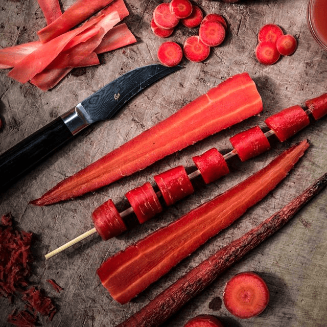 Kyoto Red – This is a Japanese Kintoki-type (sweet red) carrot. These silky red carrots are grown near Kyoto, Japan, where they are traditionally eaten on the Japanese New Year, often carved into the shape of a plum blossom to represent fertility in the coming year. These carrots have an exceptional texture and a very sweet, slightly watermelon flavor. Perfect as a roasting, grilling, dessert, and fresh juicing carrot!