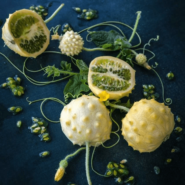 Kiwano Rund Jelly Melon – This amazing melon from Africa is about 3 inches in diameter, covered in intriguing points. The skin is pale peach to ivory colored. Flesh is juicy, sweet, and delicious. The flavor is often compared to banana and lemon. Very cute and just plain fun!