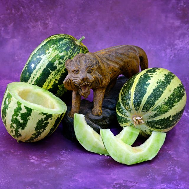 Japanese Tiger Melon – This pocket sized melon is a Japanese delicacy, with crisp, sweet flesh and beautiful tiger striped skin. These melons top out at 10-12 ounces each. In Japan these are savored as a yummy dessert, or added or salads and savory preparations—a great all-purpose melon!