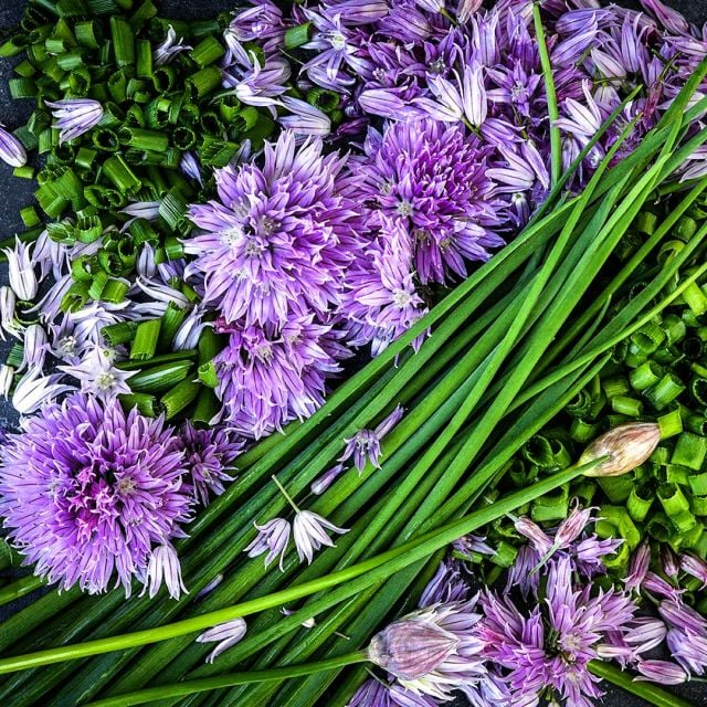 Common Chives – Wonderful, mild onion flavor. These long, thin chives are excellent in many meals; great raw or cooked. Lavender-like flowers.