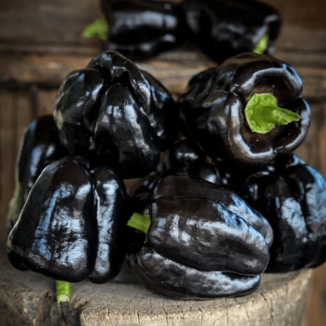 Purple Beauty Sweet Pepper – Delicious onyx-colored peppers: large, 4-inch black fruit that ripen to deep purple. These gorgeous peppers are flavorful, crisp and juicy with a thick wall, perfect raw or cooked. Note these peppers will lose their color in cooking.
