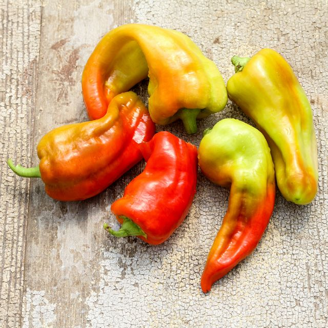 Cubanelle Sweet Pepper – Also known as “Cuban pepper”, the Cubanelle is a variety of sweet pepper commonly used in Cuban, Puerto Rican, and Dominican cuisine. Many cooks prefer it to bell types. Sweet Cubanelle peppers can some times be slightly hot, but with only a touch of heat. This 6-8-inch pepper is prized for its sweet, mild flesh, rich flavor, and pretty colors. The thin-walled pepper is especially suited for quick cooking and has a low water content. Best picked when yellow-green for use in roasting, stuffing, as a pizza topping, for frying, a substitute for Anaheim peppers, or in a yellow mole sauce, and is one of the traditional ingredients in sofrito. Cubanelle peppers are also known for their unique, imperfectly curled, wrinkled, and twisted shapes–no two seem to ever be alike.