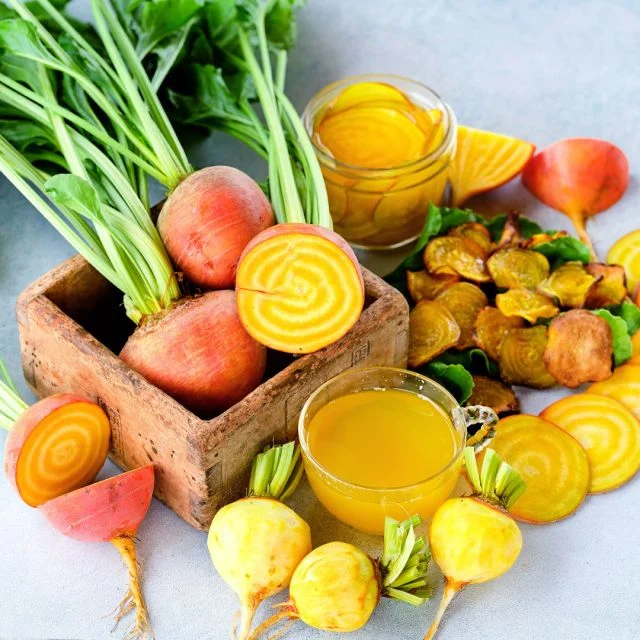 Golden Beets – A lovely yellow beet, with super sweet flesh and dense nutrition. The rich golden roots do not bleed or stain, making for less kitchen mess. It is an excellent variety for kids and people that normally don’t like beets, as the mellow flavor is much less earthy than regular red beets, and rich in folate, manganese, and, of course, beta-carotene. Yellow beets date back to at least the 1820s, but they did not become widely adopted by gardeners until Burpee Seed introduced a golden beet in the 1960s. Perfect for raw eating, roasting, juicing, and more!