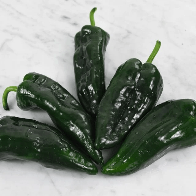 Poblano Mild Pepper – One of the most popular chilis in Mexico! 3- to 6-inch heart-shaped fruit is usually of gentle heat, at around 2000 Scovilles. Used green, after roasting and peeling, it is the classic pepper for chili rellenos. Dried, the fruit turns a rich dark red-brown and may be ground into an authentic red chili powder.