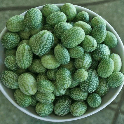 Mexican Sour Gherkin – A rampant yet delicate vine producing dozens of 1″ green and white fruit that will delight children and adults alike. Great for pickling whole and snacking on straight from the vine. Trellis for best harvest. Also known as cucamelon, mouse melon, or “sanditas” (Spanish for “little watermelon”).