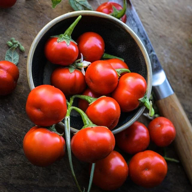 Garden Huckleberry – An antioxidant-rich garden berry that undergoes the most miraculous flavor transformation when cooked and just lightly sweetened! There is a stark contrast between eating the berries raw and in their cooked and sweetened state. The raw ripe berries have a tart flavor, similar to tomatillo, yummy for savory snacking and salsas. The cooked and lightly sweetened berries are reminiscent of blackberry or gooseberry. The garden huckleberry is native to Africa and is a solanaceous berry in the tomato family. The intense purple-black hue of the berries indicates high levels of the antioxidant anthocyanin. The truly spectacular flavor of these berries is revealed when the berries are cooked and sweetened; this brings out a fruity, blackberry-like flavor that is simply beautiful. I have made these berries into delicious jams and syrups.