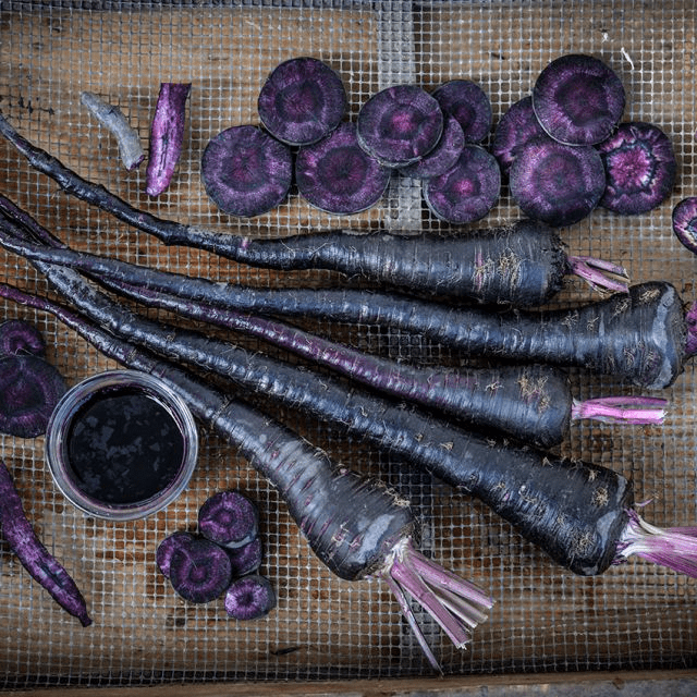 Pusa Asita Carrot – This is the world’s richest plant-based source of anthocyanin, this carrot from India is so rich in the dark-pigmented antioxidant that the roots are practically black! It is especially well suited for the south and performs better than other carrots in extreme heat. Its flavor is richer and sweeter than a regular orange carrot, and the color deepens as carrots mature, even bleeding like a beet when cut.